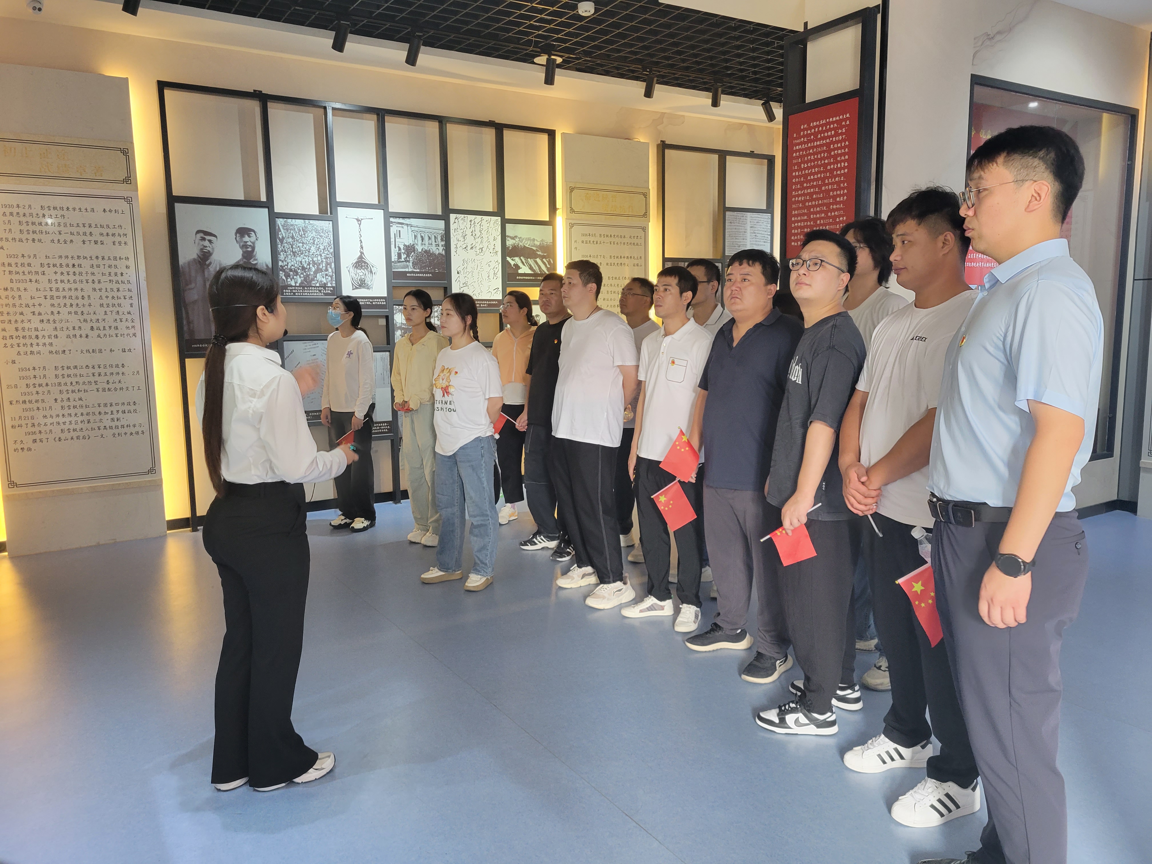 參加此次活動的黨員、團員手持國旗從分公司徒步出發(fā)至雪楓烈士陵園,在彭雪楓紀念館聽取館內(nèi)講解,了解革命歷史,學習先烈的英雄事跡。參觀結(jié)束后,分公司志愿者行進到烈士墓園,進行祭掃活動,向革命先烈致以最崇高的敬意。