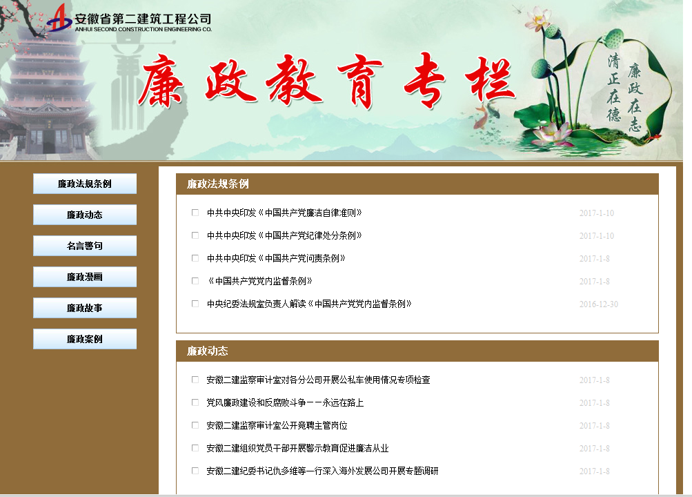 該專欄以公司網(wǎng)站為依托,設(shè)有廉政法規(guī)條例、廉政動態(tài)、名言警句、廉政漫畫、廉政故事、廉政案例六大板塊。通過廉政法規(guī)條例,轉(zhuǎn)載《中國共產(chǎn)黨廉潔自律準(zhǔn)則》、《中國共產(chǎn)黨紀(jì)律處分條例》、《中國共產(chǎn)黨問責(zé)條例》、《安徽省預(yù)防職務(wù)犯罪條例》等一系列黨紀(jì)黨規(guī)、國家法律法規(guī)知識,并在每一次修訂后及時更新,為廣大黨員干部學(xué)習(xí)使用提供方便。運用廉政動態(tài),及時發(fā)布集團(tuán)紀(jì)委和公司黨委、紀(jì)委通知要求,通報監(jiān)察審計事項與結(jié)果,做到監(jiān)督的公開化、透明化。以名言警句、廉政漫畫、廉政故事、廉政案例感染人、陶冶人,內(nèi)容直觀形象,用勤廉典型激勵人,深入剖析典型違紀(jì)案例,加強警示教育。