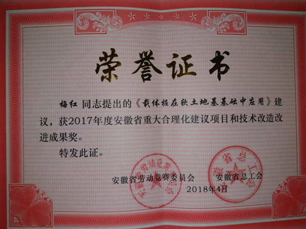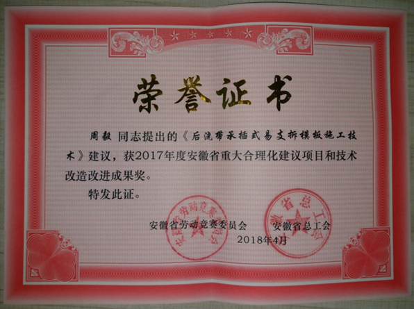 在日前召開的安徽省慶?!拔逡弧濒摺爱?dāng)好主人翁、建功新時代”勞動競賽推進(jìn)大會上,對獲得榮譽稱號的先進(jìn)集體和先進(jìn)個人進(jìn)行了表彰頒獎。我公司技術(shù)質(zhì)量部主任周毅提出的《后澆帶承插式易支拆模板施工技術(shù)》和副主任梅紅提出的《載體樁在軟土地基基礎(chǔ)中應(yīng)用》建議,雙雙榮獲2017年度安徽省重大合理化建議項目和技術(shù)改造改進(jìn)成果獎。