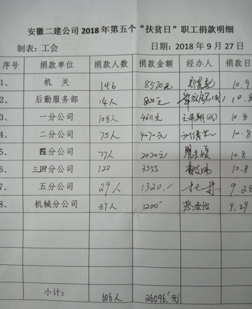 1017日全國(guó)第五個(gè)“扶貧日”即將到來之際,安徽二建公司積極響應(yīng)集團(tuán)公司號(hào)召,繼續(xù)在全體職工中開展向集團(tuán)對(duì)口幫扶貧困鄉(xiāng)村捐款活動(dòng)。
