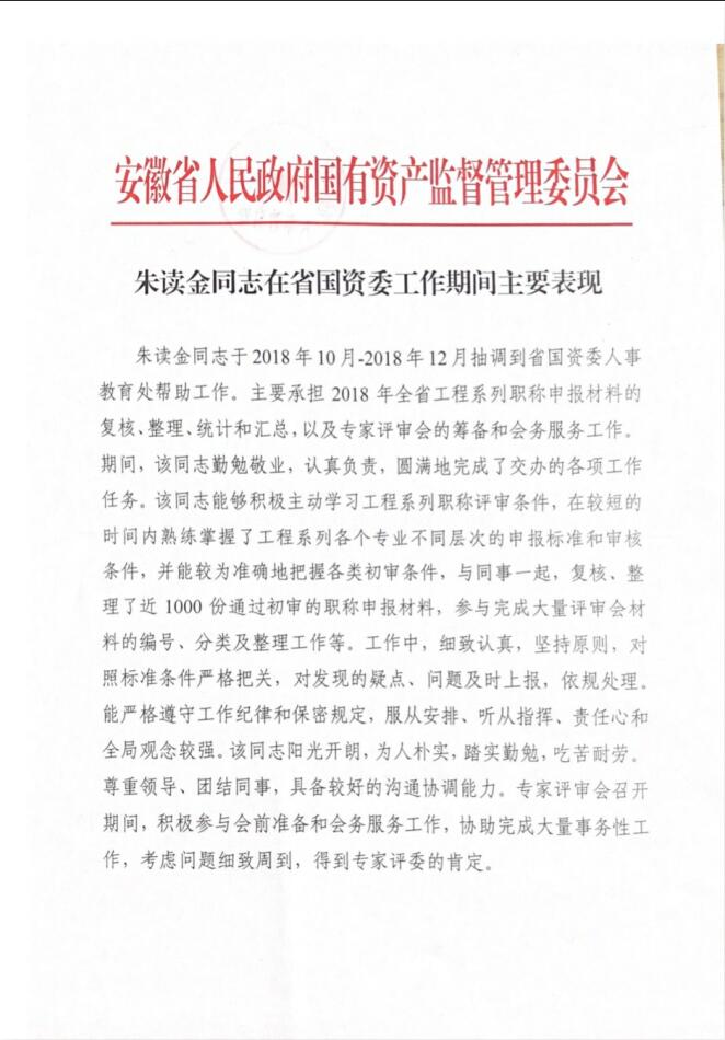 2018年10月-2018年12月被抽調(diào)到省國(guó)資委人事教育處幫忙工作,周末加班加點(diǎn),兢兢業(yè)業(yè),與國(guó)資委同事一同審查近1000份職稱申報(bào)材料,工作得到專家評(píng)委一致肯定。