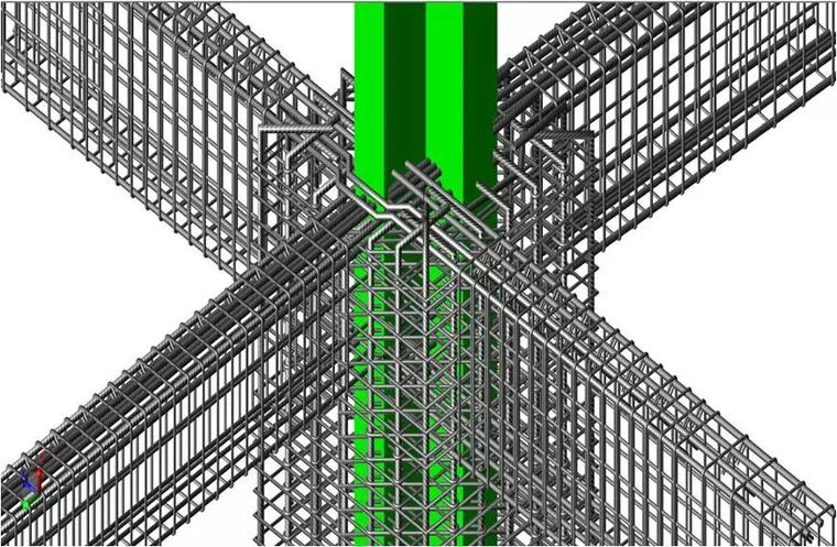 在復雜節(jié)點的地方,鋼筋的碰撞發(fā)揮著重要的作用。在型鋼混凝土梁柱節(jié)點處,鋼筋數(shù)量眾多,且因為型鋼的存在,造成梁的縱向鋼筋無法直接拉通。BIM工程師搭建節(jié)點模型,對鋼筋的排布進行調(diào)整,通過繞彎、預留洞口、焊接等方式,避免鋼筋與型鋼的碰撞。