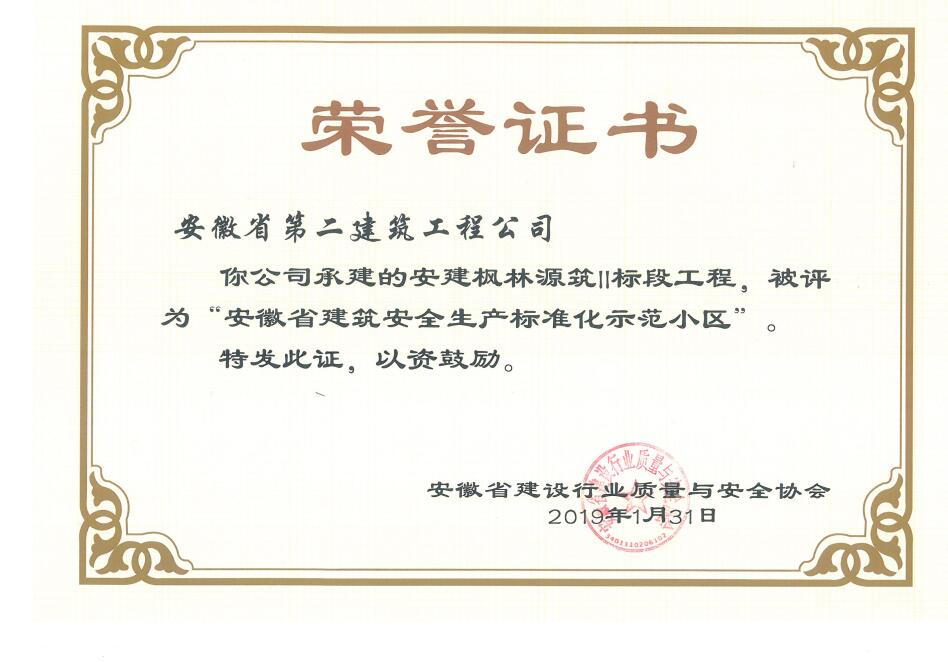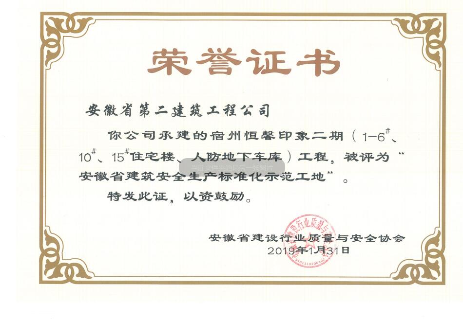 近日,從安徽省建設(shè)行業(yè)質(zhì)量與安全協(xié)會獲悉,安徽二建承建的肥西涼亭雅苑、阜陽楓林源筑、阜陽廣元大學(xué)城、宿州恒馨印象、淮北東岳雅苑5個(gè)項(xiàng)目獲得2018年度“安徽省建筑施工安全生產(chǎn)標(biāo)準(zhǔn)化示范工地”稱號,為公司再添榮譽(yù)。