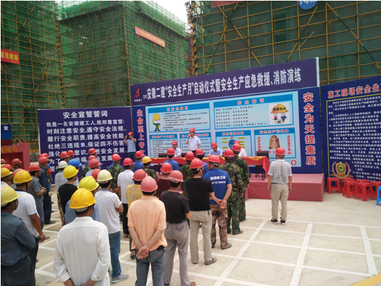 6月16日上午,安全管理部組織、信訪保衛(wèi)部及后勤綜合服務(wù)部協(xié)同在五分公司固鎮(zhèn)名邦國際花都項目開展6.16安全咨詢?nèi)?、安全宣誓、簽名、?yīng)急救援演練、職工體檢、安全主題宣講、安全生產(chǎn)經(jīng)驗交流、安全教育場館體驗、安全宣傳圖牌展覽等一系列“安全生產(chǎn)月”宣傳教育活動,分管安全副總經(jīng)理葉和永任總指揮,項目部全體管理人員及工人共一百余人參加。