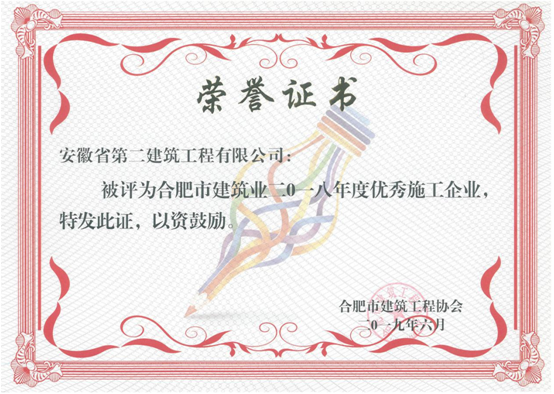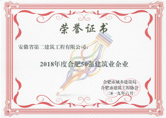 日前,公司被合肥市城鄉(xiāng)建設委員會、合肥市建筑工程協(xié)會授予“2018年度合肥市50強建筑業(yè)企業(yè)”、“優(yōu)秀施工總承包企業(yè)”、“質(zhì)量管理先進企業(yè)”、“安全管理先進企業(yè)”、“外向輸出先進企業(yè)”、“統(tǒng)計管理先進企業(yè)”、“起重設備安全管理先進企業(yè)”。張尚禮同志獲“安徽省優(yōu)秀項目經(jīng)理”稱號,崔俊、鄭慧君、任兵三名同志獲“合肥市優(yōu)秀項目經(jīng)理”稱號;蒯家江同志獲“合肥市外向輸出先進個人”稱號;曹建同志獲“合肥市安全管理先進個人”稱號;王貴宏同志獲“合肥市質(zhì)量管理先進個人”稱號;周俊同志獲“合肥市起重設備安全管理先進個人”稱號。