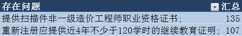 通過(guò)分析不符合條件人員的問(wèn)題發(fā)現(xiàn),存在“提供掃描件非一級(jí)造價(jià)工程師職業(yè)資格證書(shū)”、“重新注冊(cè)應(yīng)提供近4年不少于120學(xué)時(shí)的繼續(xù)教育證明”這兩大問(wèn)題的人員較多,分別為135人和107人,占所有不符合初始注冊(cè)條件人數(shù)的49.2%。