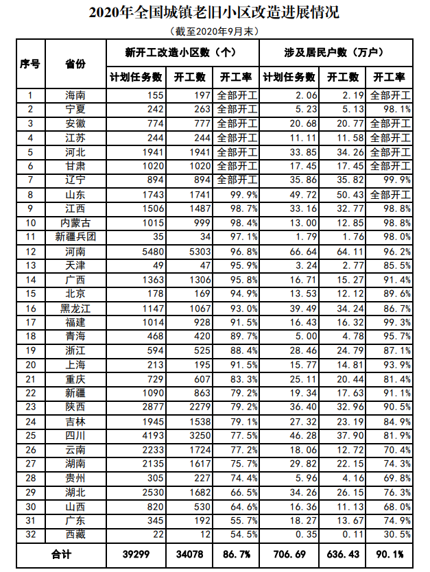 2020年1-9月份全國城鎮(zhèn)老舊小區(qū)改造進展情況如下