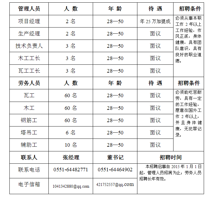 因安徽省第二建筑工程公司承建的阿爾及利亞阿爾及爾654套住房項(xiàng)目及太把薩大學(xué)城工程項(xiàng)目的需要,現(xiàn)公開面向社會(huì)招聘項(xiàng)目管理人員及勞務(wù)工人,具體招聘事項(xiàng)見附表。