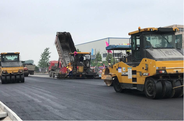 2017年5月3日上午9:58,安徽二建太和市政道路項目現(xiàn)場彩旗飄揚、機器轟鳴,攤鋪機、壓路機、運料車等各種機械設(shè)備有條不紊地進行著瀝青路面試驗段施工。