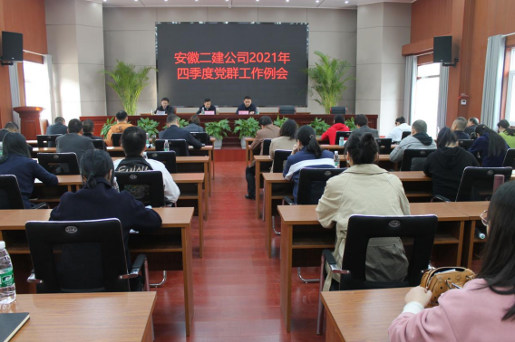 10月26日上午,安徽二建公司召開2021年四季度黨群工作例會,公司黨委副書記、工會主席王軍,黨委委員、紀委書記沈壯出席會議,機關黨群部門全體人員、基層各單位黨支部書記、團支部書記、綜合辦人員參會。會議由黨委工作部主任施用宏主持。