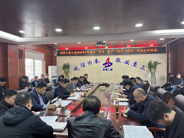 春潮涌動,新意盎然。3 月7日下午,安徽二建公司在一樓會議室召開了2022年3月安全、質(zhì)量、生產(chǎn)、決算、債權(quán)、法務(wù)工作例會。公司總經(jīng)理李建成、副總經(jīng)理費勤波出席會議,公司相關(guān)部門負責人、所屬各單位經(jīng)理、分管領(lǐng)導及工管、安全科長參加會議,副總經(jīng)理葉和永主持會議。