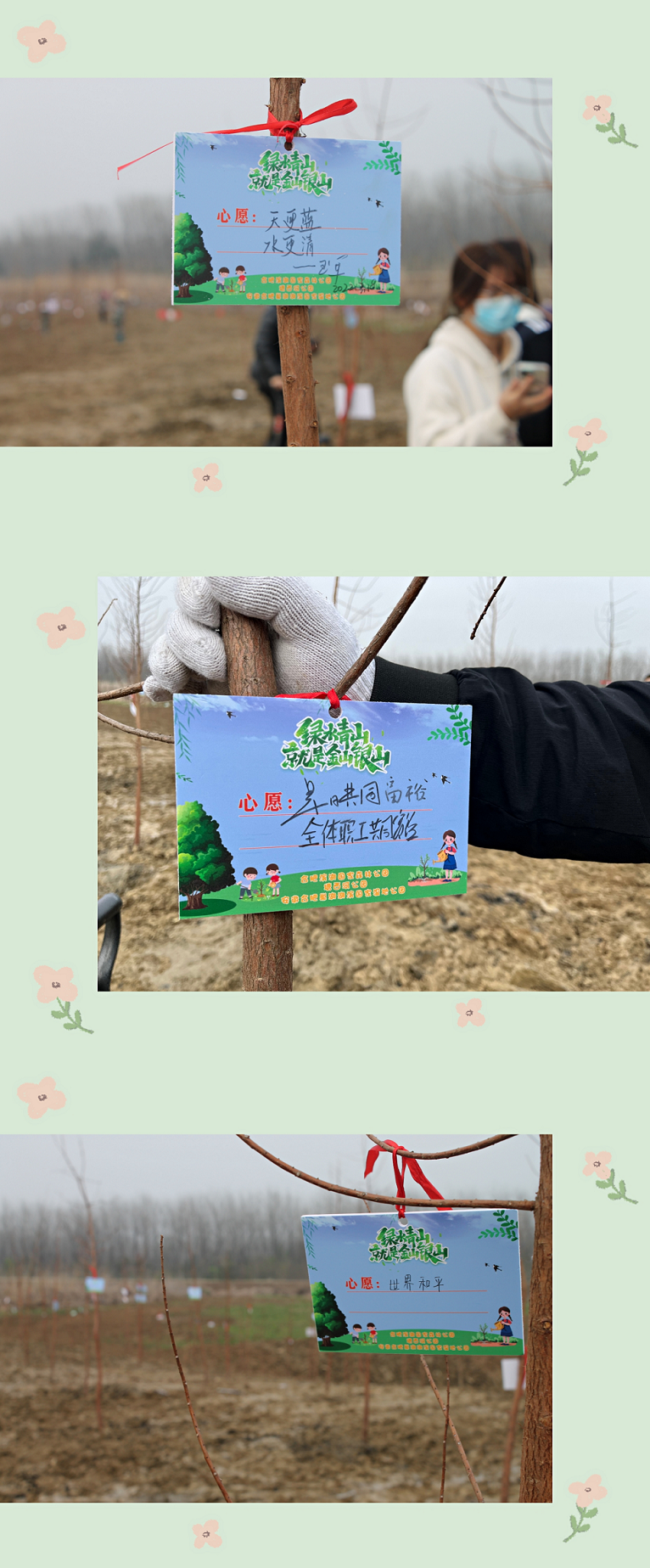 大家個個干勁十足,不畏辛苦,圓滿完成了種植任務(wù),還給自己種下的樹苗掛上了心愿卡片。