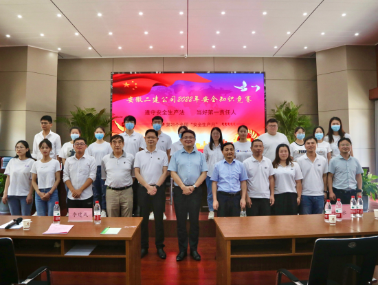 今年六月是第21個“全國安全生產(chǎn)月”,為了貫徹落實活動主題“遵守安全生產(chǎn)法 當(dāng)好第一責(zé)任人”,用以賽促學(xué)、以活動促宣傳的方式提高廣大職工的安全意識,6月17日上午,公司工會牽頭,與安全管理部聯(lián)合舉辦了安徽二建2022年安全知識競賽活動。公司黨委副書記、總經(jīng)理李建成,黨委副書記、工會主席王軍出席活動,黨委委員、副總經(jīng)理葉和永,安全總監(jiān)、安全管理部主任曹建,工會副主席、女工委主任王俊出席并擔(dān)任評委。