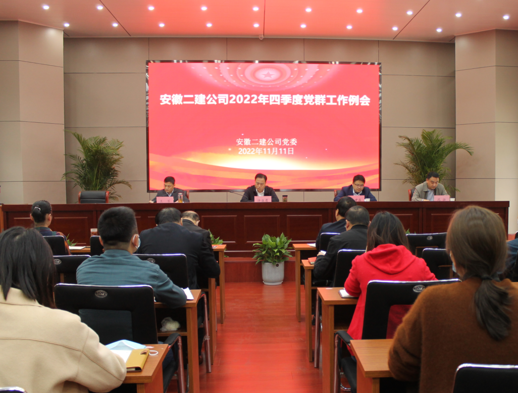 11月11日上午,安徽二建公司召開2022年四季度黨群工作例會。黨委書記、董事長許業(yè)勇出席會議并講話,公司領(lǐng)導(dǎo)李建成、王軍、沈壯出席會議,黨群部門人員、所屬各單位黨支部書記、工會主席、團支部書記、綜合辦負(fù)責(zé)黨務(wù)工作人員參會。會議由王軍主持。
